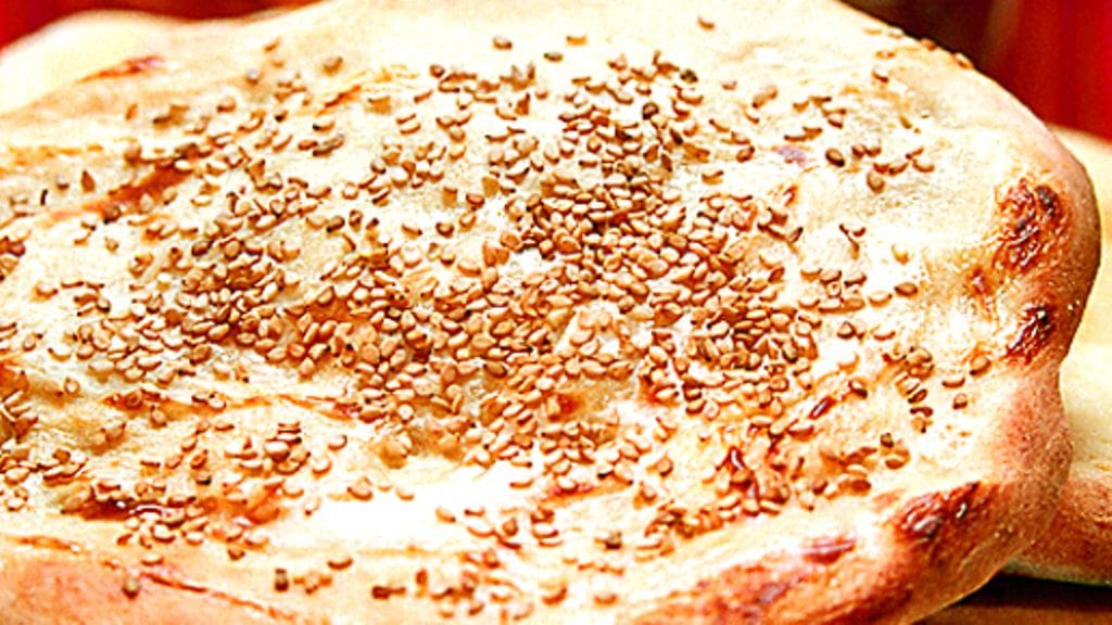 3. Painele jokainen taikinapallo litteäksi, n. 20 cm leveäksi ja 30 cm pitkäksi leiväksi. Leivät pitää paistaa erissä. Laita 2 kerrallaan öljytylle pellille. Sivele jogurtilla ja ripottele päälle seesaminsiemeniä. Laita pelti kuuman uunin keskitasolle. Vahdi leipiä tarkoin, jos niihin nousee suuria kuplia, pistä niihin reikä terävällä veitsellä. Leivät ovat valmiita, kun niissä on hieman vaaleanruskeita laikkuja, n. 5-10 minuuttia uunista riippuen. Laita valmiit leivät ritilälle jäähtymään liinan alla.