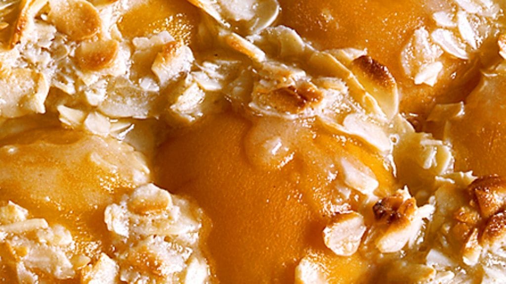 1. Kuumenna uuni 225 asteeseen. Valuta persikat ja laita ne uunivuokaan.