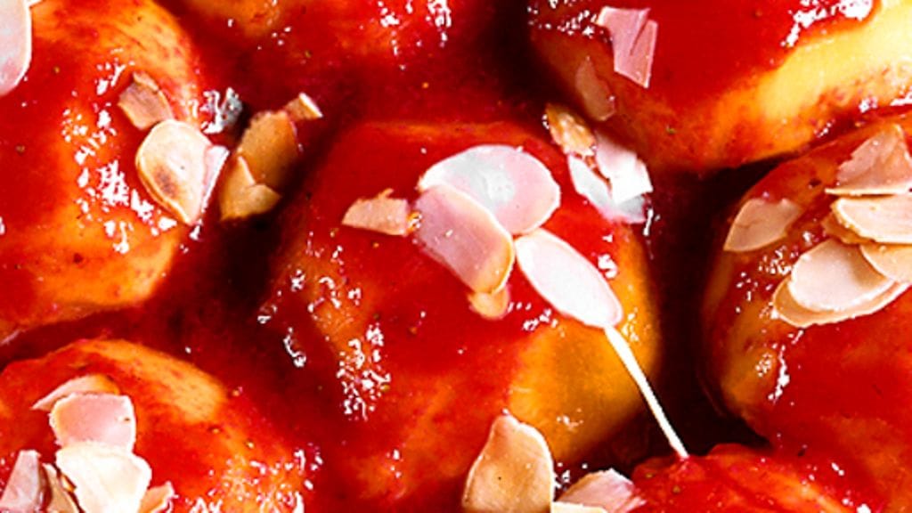 4. Kaada kastike persikoille. Koristele kiivillä ja paahdetuilla mantelilastuilla.