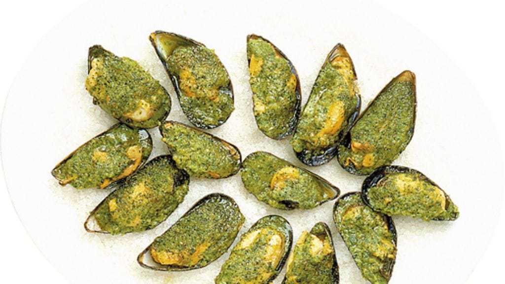 3. Pane simpukankuoret uuninkestävään vuokaan suolapedin päälle. Gratinoi 5-6 minuuttia, kunnes voi sulaa. Vinkki: säästä simpukkaliemi keittoa tai kastiketta varten.