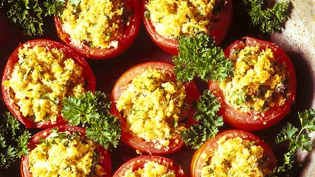 2. Kuumenna uuni 250 asteeseen. Sekoita täytteen ainekset, käytä sen verran öljyä, että se sitoo ainesosat. Täytä tomaatit. Paista uunin alatasolla, kunnes ne tuntuvat kypsiltä.