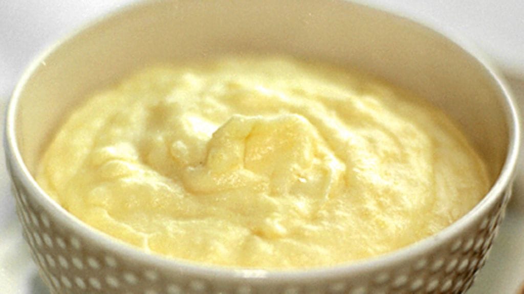 2. Lisää voi, suola ja pippuri. Lämmitä kerma ja maito kasarissa. Sekoita kermamaito vähän kerrallaan perunaseokseen. Vatkaa nopeasti kuohkeaksi soseeksi.
