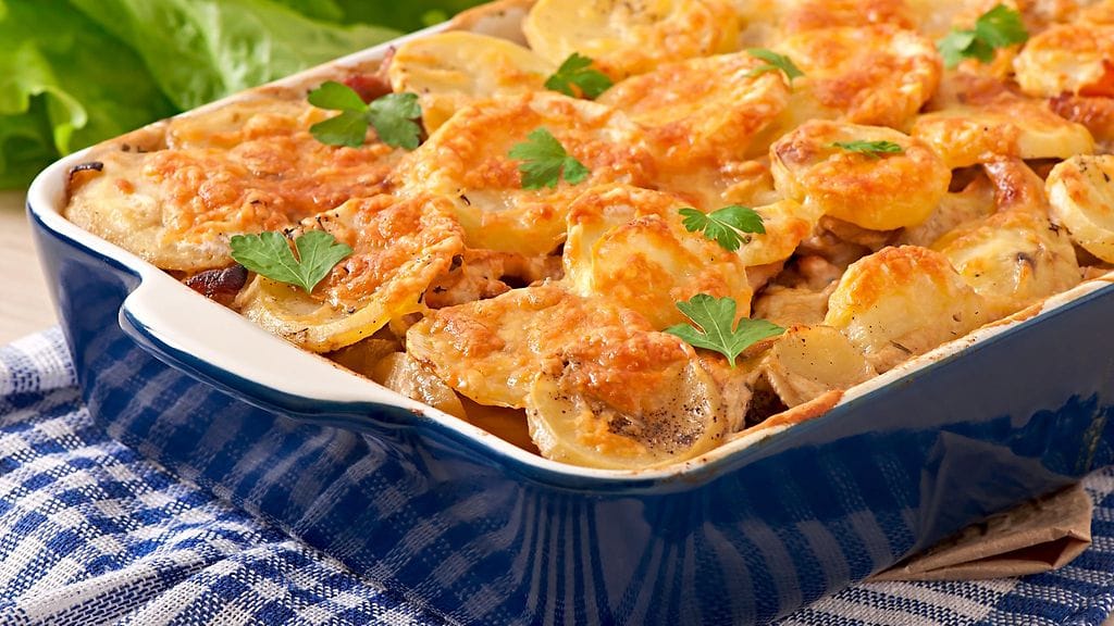 - Pese ja kuori perunat. Leikkaa perunoista noin 2 mm:n paksuisia viipaleita tai käytä pakasteperunaviipaleita.