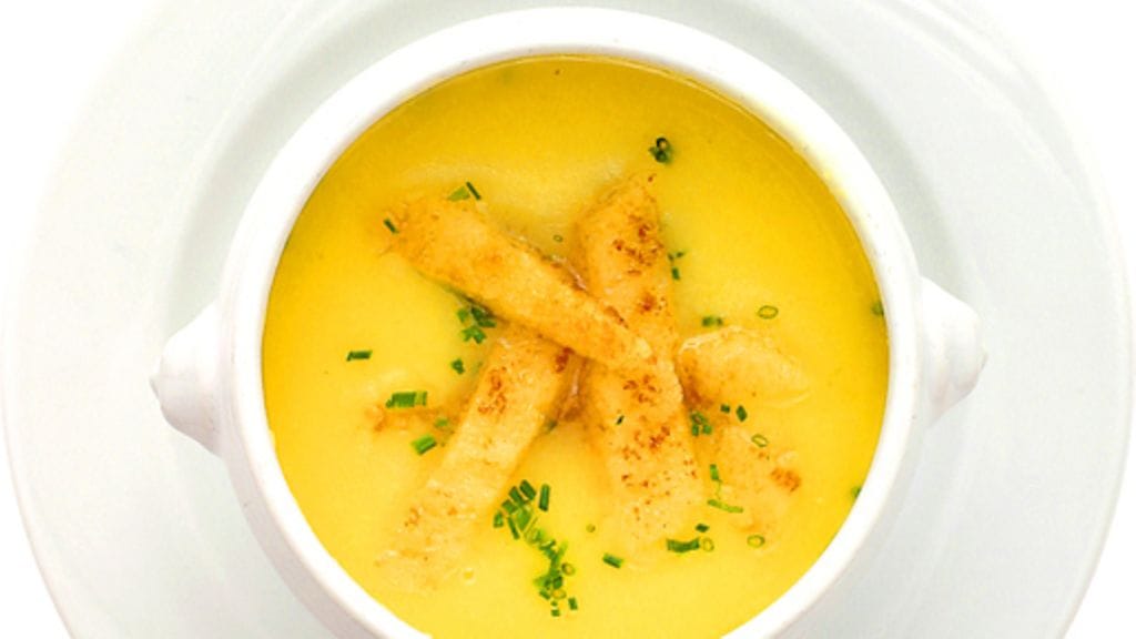 3. Kaada peruna-purjosose takaisin kattilaan. Lisää loppu kasvisliemi ja kuumenna keitto hitaasti kiehumispisteeseen. Tarjoa keiton lisänä leipäkrutonkeja.