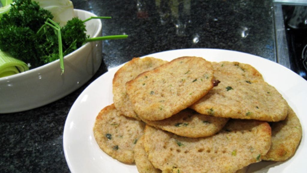 Suikaloi purjo ja sekoita ainekset sileäksi taikinaksi. Vaivaa kunnes taikina irtoaa kulhon reunoista. Taputtele taikinaa leivinpaperille pieniksi rieskoiksi jauhotetuin sormin.