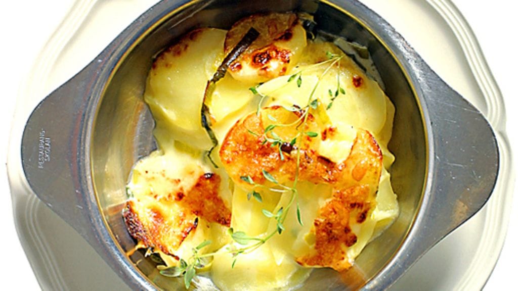 3. Paista uunin keskitasolla 60-75 minuuttia kunnes perunat ovat pehmenneet, kermamaito imeytynyt gratiiniin ja pinta paistunut kullanruskeaksi.