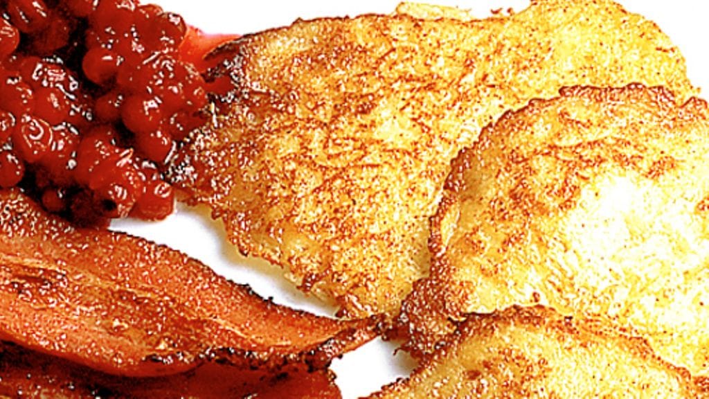 3. Paista taikinasta pieniä lettuja voissa keskilämmöllä, niin että peruna ehtii kypsyä kauttaaltaan. Tarjoile puolukkasurvoksen ja paistetun pekonin kera.