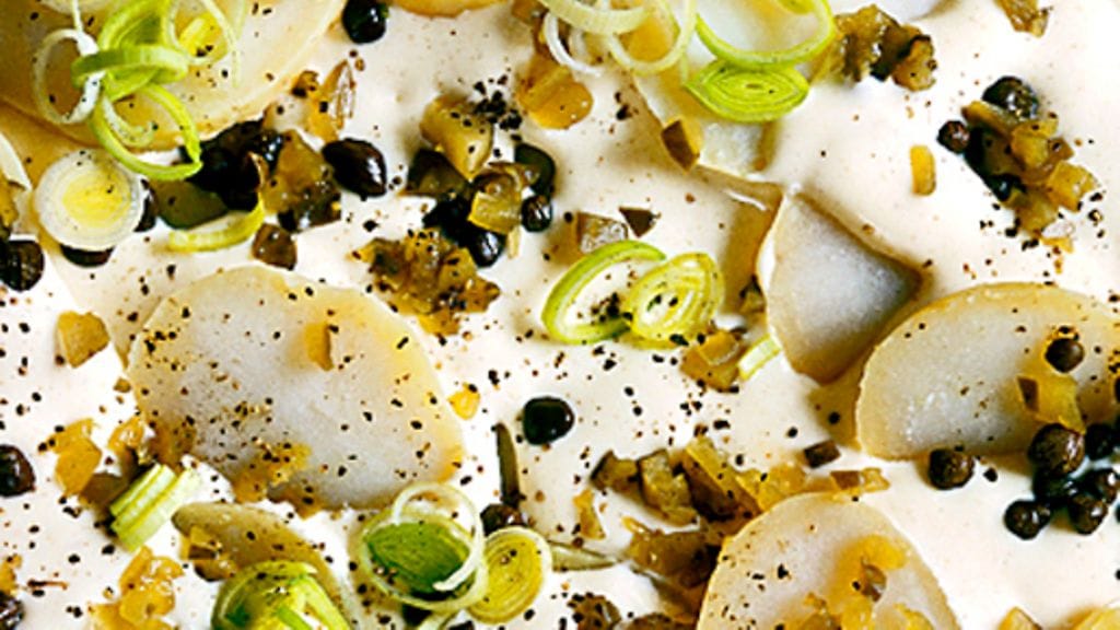 4. Kaada kastike perunoille, ripottele päälle kapriksia, suolakurkkua ja maustepippuria.