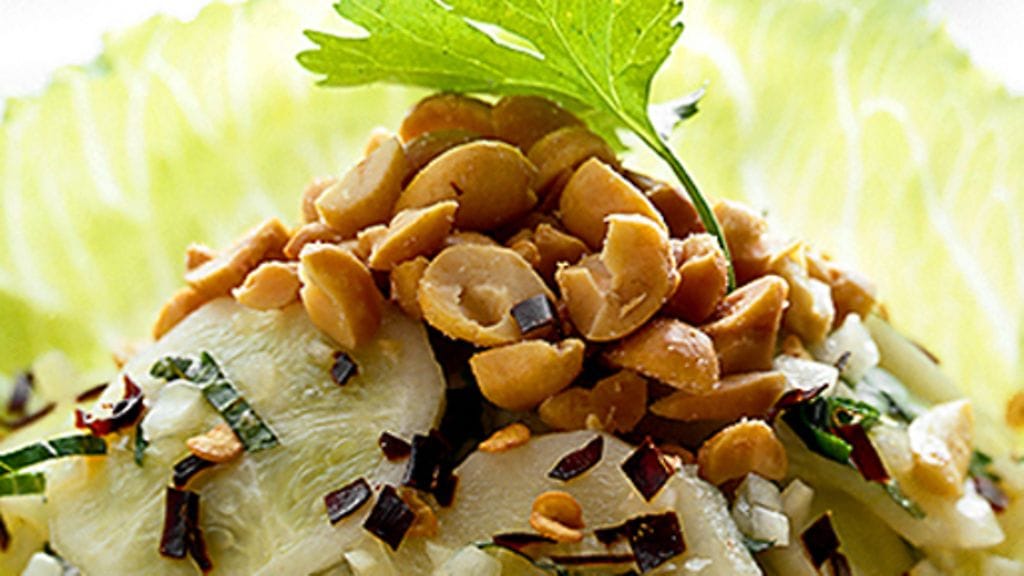 3. Aseta jäävuorisalaattia tarjoilukulhon pohjalle. Lisää perunasalaatti ja ripottele päälle sipulia ja pähkinöitä. Koristele tuoreella korianterilla.