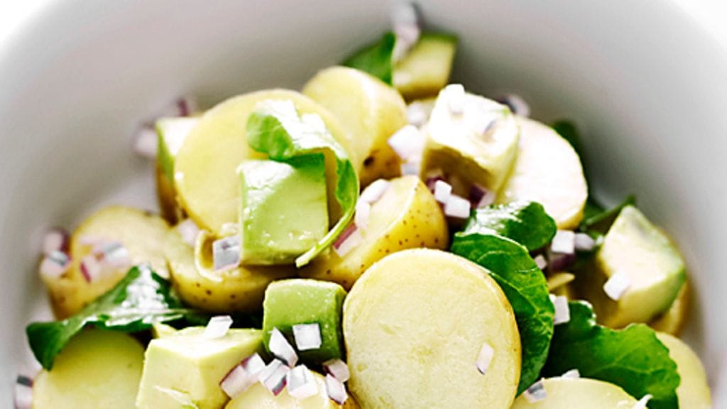 2. Purista limeteistä mehu. Leikkaa perunat viipaleiksi. Halkaise avokadot, poista siemenet ja kuutioi malto sentin kuutioiksi. Sekoita ne puoleen limettimehusta. Silppua punasipuli ja sekoita kulhossa perunoiden ja avokadojen kanssa.