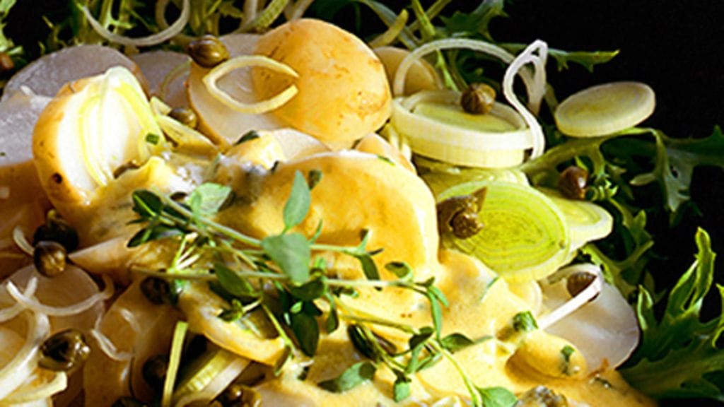 3. Pohjusta tarjoiluvati salaatinlehdillä. Kääntele kastike perunoihin ja lisää purjo. Asettele sekoitus salaatinlehdille. Koristele kapriksilla.