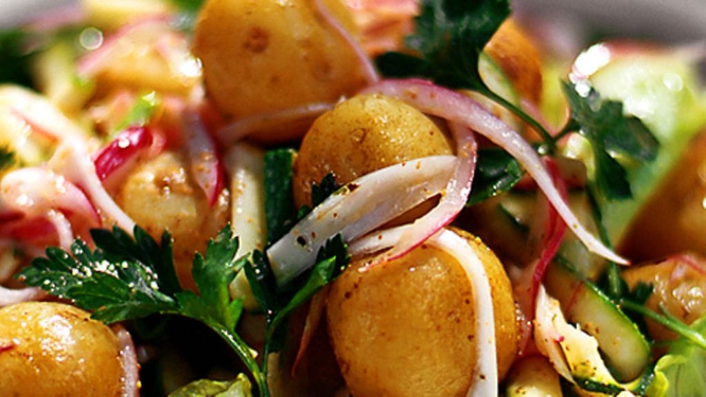 3. Pohjusta tarjoiluvati salaatilla. Kääntele kastike perunoihin, lisää sipuli ja korianteri. Asettele seos salaatin päälle.