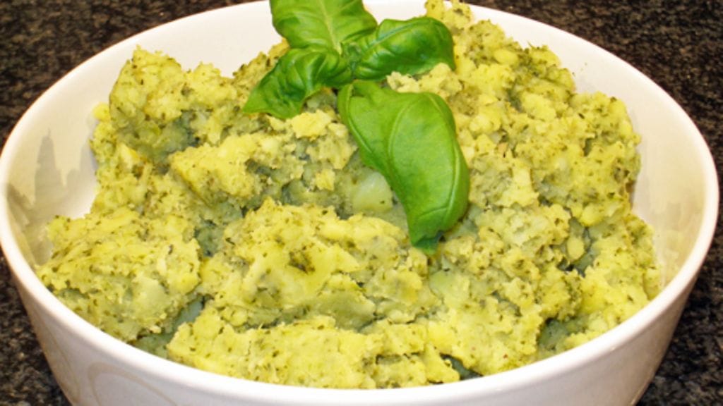 Perinteiseen perunamuusiin saa makua, kun lisää siihen pestokastiketta.