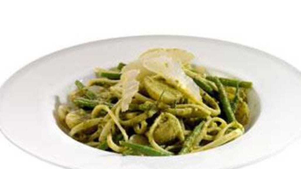 Sekoita keitetyt raaka-aineet sekä pesto, creme fraiche ja Grana Padano juusto keskenään. Lisää myös muutama ruokalusikallinen keittolientä. Sekoita ainekset hyvin keskenään ja tarjoile runsaan mustapippurin kera.