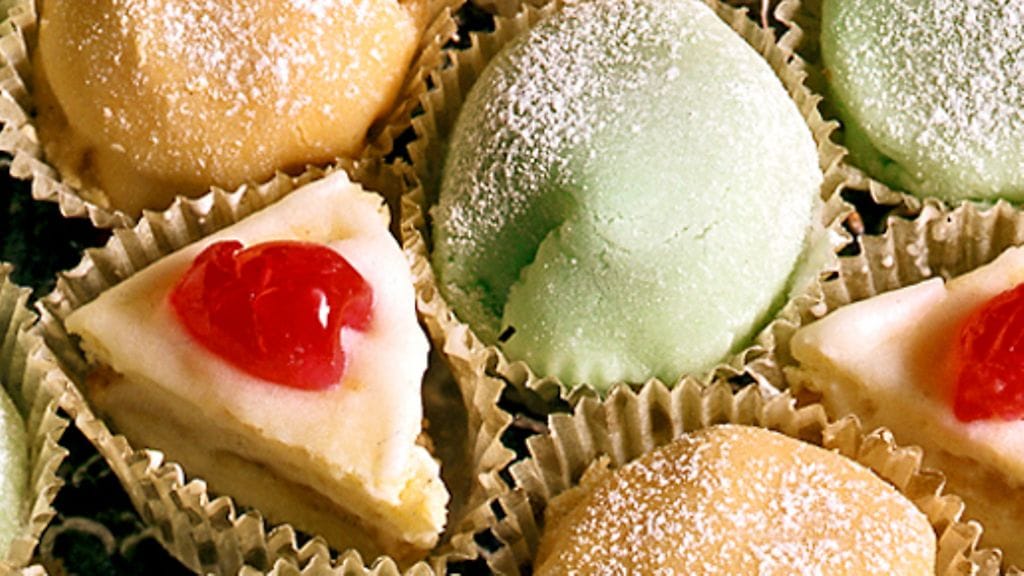 5. Värjää marsipaani toivomasi väriseksi elintarvikevärillä ja kaulitse ohueksi kevyesti jauhotetulla alustalla. Ota levystä pikkuleipiä hieman suurempia, pyöreitä paloja.