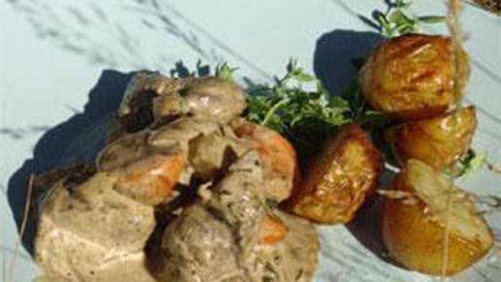 Kiehauta kerma sivukeittimelle nostetussa kattilassa ja mausta se timjamilla, mustapippurilla ja lihojen marinadiliemellä. Kun olet kaatanut liemen lihoista kerman joukkoon, sivele marinoidut palat öljyllä ja grillaa niiden pinnat. Nosta grillatut palaset kiehuvaan kermaan ja hauduta tovi. Tarjoa padan kanssa keitettyä riisiä tai uuniperunoita ja salaattia.