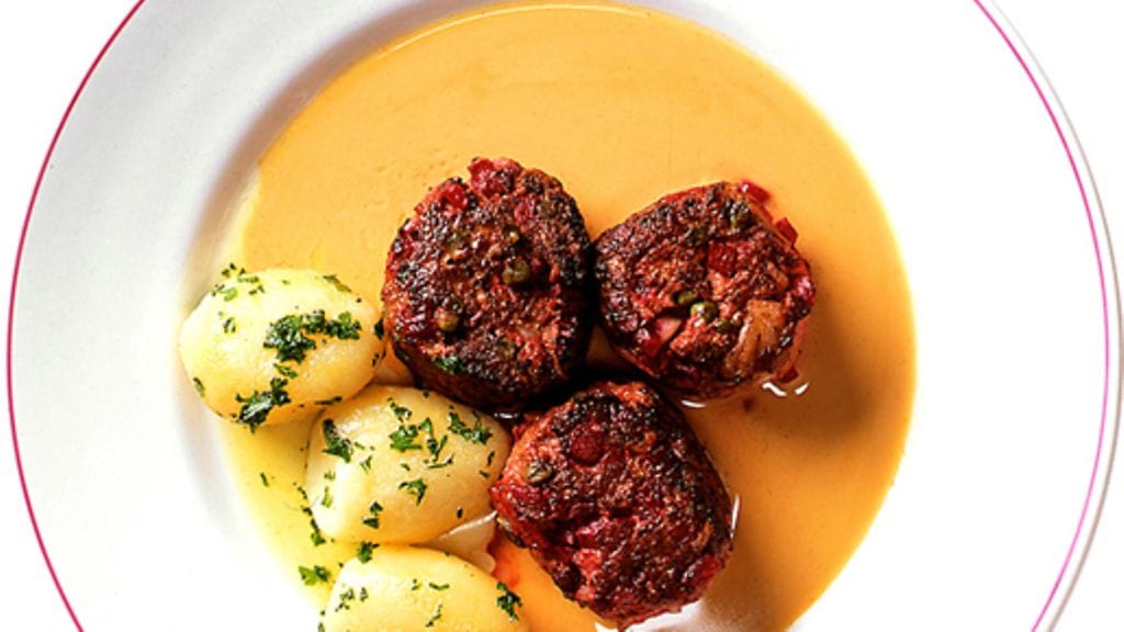 1. Raasta keitetty peruna karkeasti. Kuori ja hienonna sipuli. Hienonna punajuuri ja kaprikset. Työstä jauheliha notkeaksi keltuaisten kanssa, mausta pippurilla ja suolalla. Lisää kerma. Sekoita lopuksi mukaan perunaraaste, punajuuret, sipuli ja kapris. Älä työstä taikinaa liikaa, vain niin että ainekset sekoittuvat.