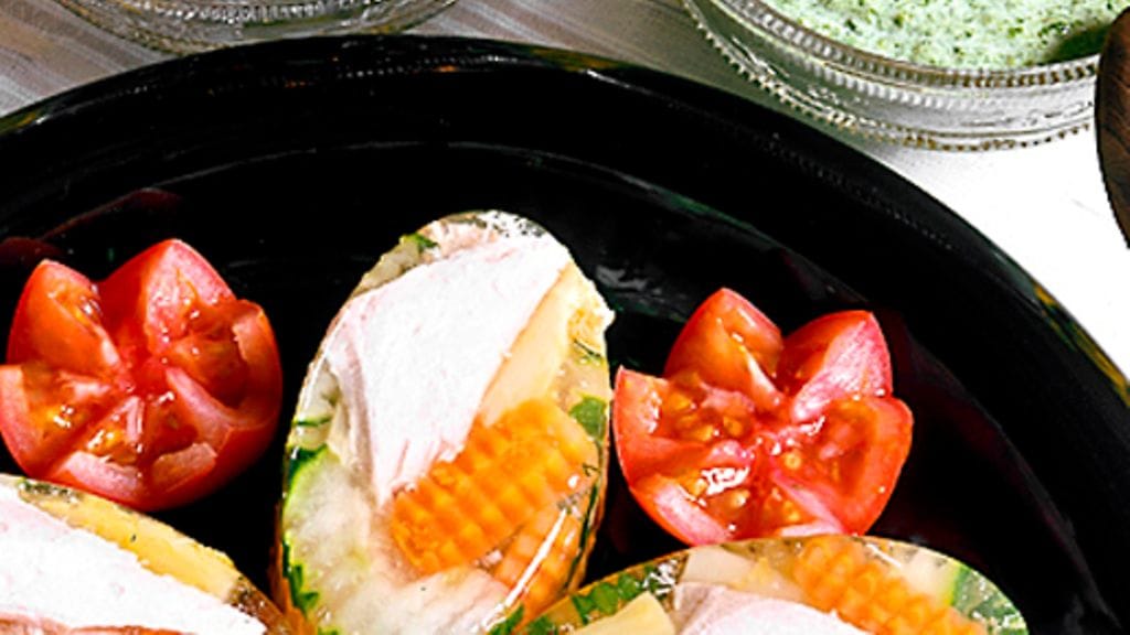 4. Jaa lohipalat ja vihannekset vedellä huuhdeltuihin annosvuokin. Kaada päälle lientä, niin että se peittää ainekset ja laita vuoat kylmään hyytymään. Kumoa hyytyneet pikkualadobit tarjoiluvadille.