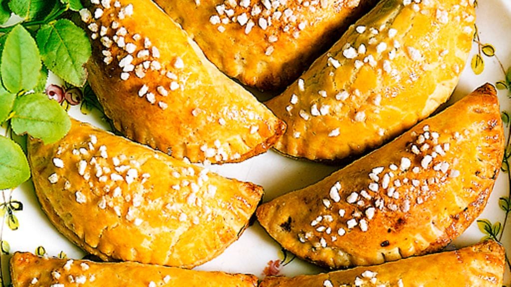 2. Kuumenna uuni 200 asteeseen. Sekoita marjat ja kookos. Kaulitse taikina ja ota siitä läpimitaltaan n. 8-10 cm ympyröitä. Laita hieman täytettä jokaiselle ympyrälle, käännä reunat yhteen puolikuiksi ja painele yhteen.