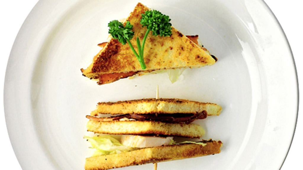 2. Paahda leipäviipaleet ja levitä päälle margariinia. Jaa leivät kolmioiksi ja laita yksi kolmio jokaiselle lautaselle. Laita viipaleille salaattia, majoneesia ja kurkkua. Viipaloi kana ja lisää voileiville. Jatka tomaatilla, sipulilla ja rapealla pekonilla.