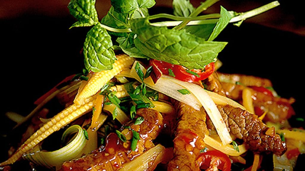 2. Wokkaa sekoitus öljyssä ja suolaa. Lisää minimaissit aivan loppupuolella. Sekoita joukkoon makea chilikastike, kuumenna ja tarjoile heti.