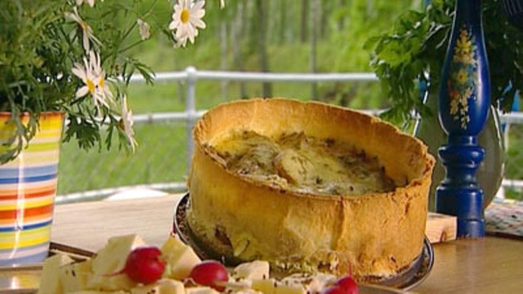 Asettele piiraspohjalle perunaviipaleet, persilja, sipulit ja juusto ja kaada päälle kerma-munaseos. Paista 35-40 minuuttia.