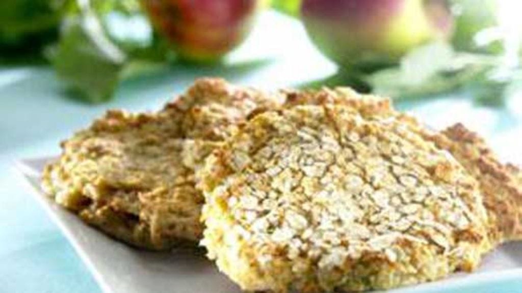 Sekoita aineet keskenään. Lusikoi taikinasta nokareita leivinpaperille uunipellille ja tasoita ne lusikalla ohuiksi rieskoiksi. Ripottele pinnalle kaurahiutaleita.