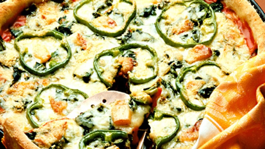 3. Vatkaa munat, kerma ja maito, mausta suolalla ja pippurilla. Levitä pinaatti ja tomaatit piirakkakuoreen ja kaada munamaito päälle. Paista uunissa n. 10 minuuttia. Ota piirakka uunista, ripottele päälle paprikarenkaat. Peitä foliolla ja paista vielä 15 minuuttia. Tarjoile haaleana tai kylmänä.