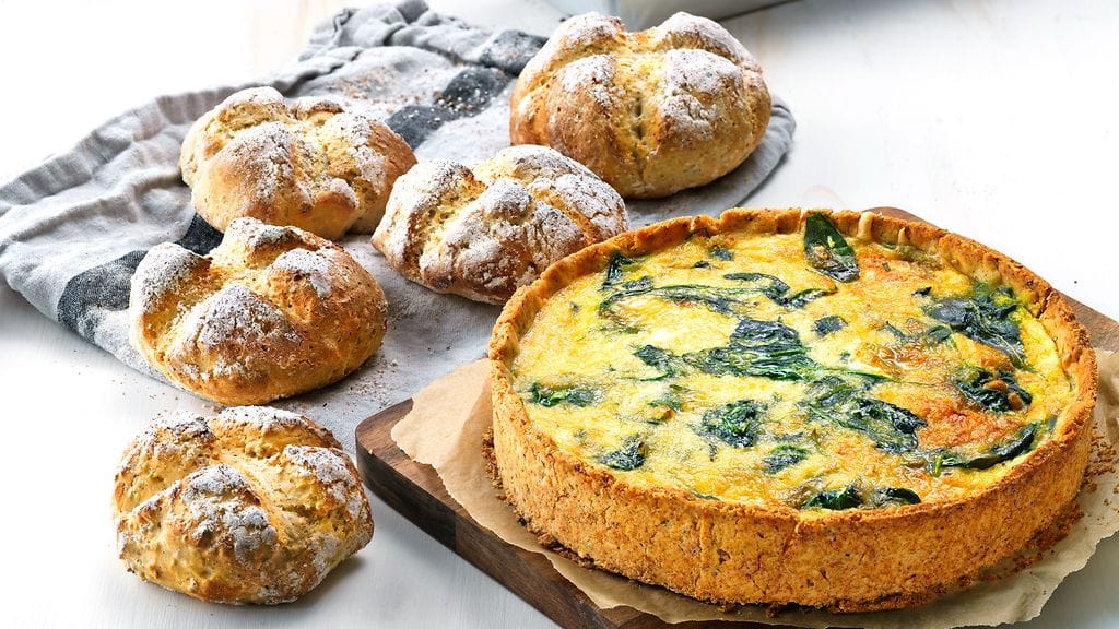Lisää pinaatti sekä juustoraaste piirakkapohjan päälle ja kaada muna-maitoseos päällimmäiseksi.