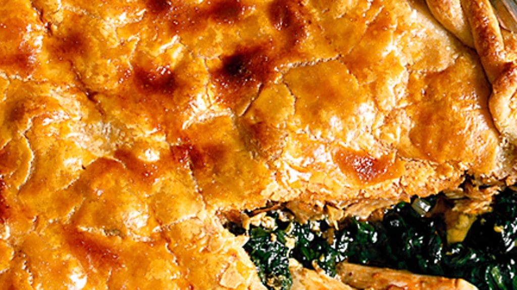 6. Kaulitse taikinalevyt yhteen ja muotoile kanneksi. Peitä vuoka, pistele siihen muutama ilmareikä ja tee ylijäämätaikinasta koristeita. Penslaa taikina kananmunalla ja paista uunissa n. 20 minuuttia.