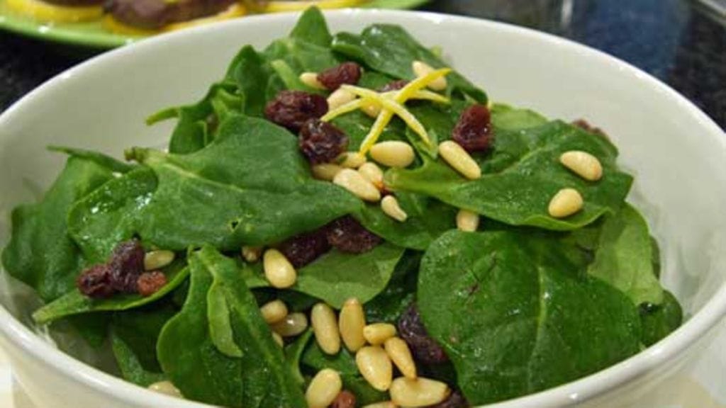 Laita rusinat tilkkaan lämmintä vettä ja anna pehmetä puolisen tuntia. Pese pinaatinlehdet huolella ja kuivaa ne. Sekoita tarjoiluastiassa pinaattiin rusinat ja pinjansiemenet. Mausta suolalla ja oliiviöljyllä.