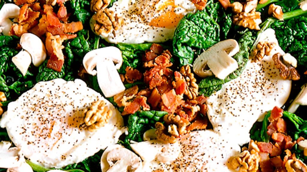 2. Paista pekoni, viipaloi sienet. Asettele pinaatit vadille sienten ja pekonin kera. Mausta.