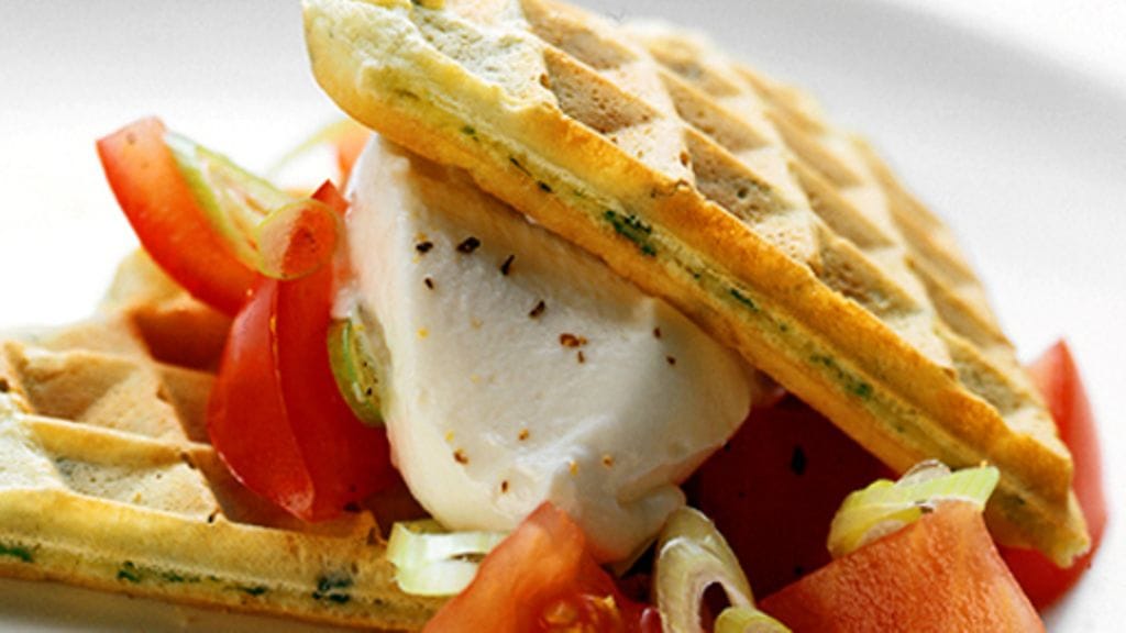 3. Paloittele tomaatti. Kuori ja suikaloi sipuli. Sekoita tomaatti, sipuli, viinietikka ja öljy. Viipaloi mozzarella. Laita neljä vohvelisydäntä lautasille, asettele päälle tomaattisalaattia ja mozzarellaa ja jauha päälle mustapippuria. Viimeistele vohvelisydämillä ja tarjoile heti.