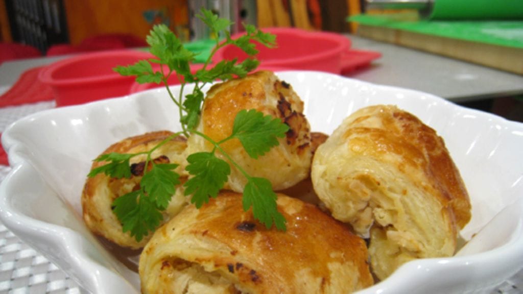 Jäähdytä ja hienonna kypsät suikaleet. Kuori ja hienonna päärynä pieneksi. Sekoita broileri, päärynä, tuorejuusto ja hunaja keskenään. Kauli voitaikinalevyjä isommiksi ja levitä täytettä levyille. Rullaa molempia pitkiä sivuja kohti keskustaa. Leikkaa rullat pituussuunnassa kuuteen osaan. Voitele pasteijat kananmunalla ja aseta leivinpaperin päälle uunipellille.