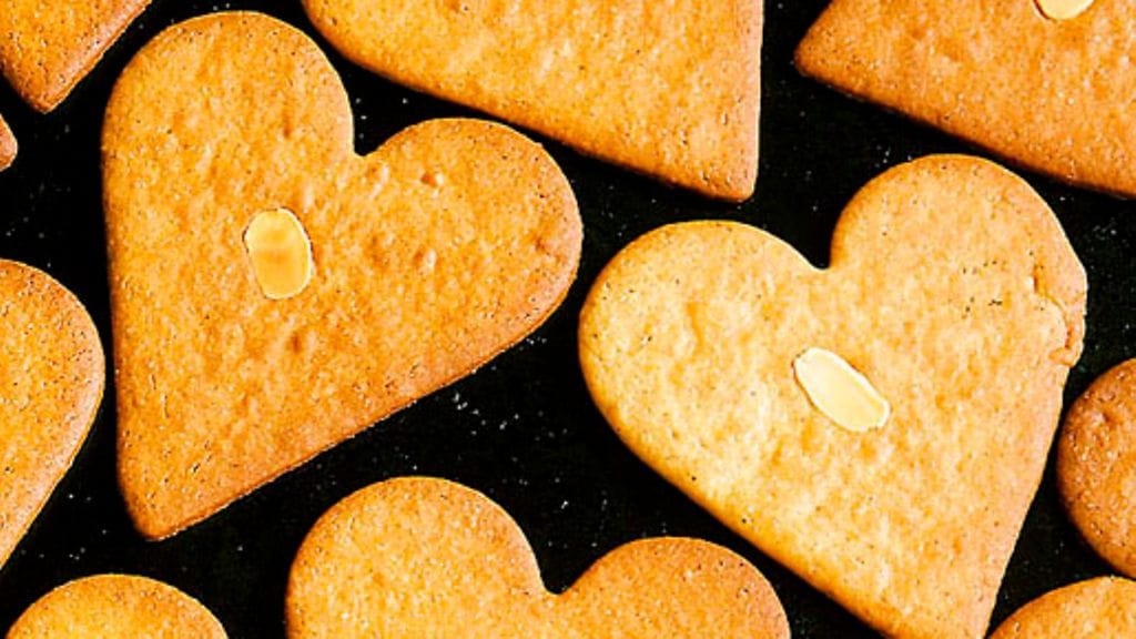 5. Kaulitse pala taikinaa kerrallaan, anna lopun taikinan olla jääkaapissa. Ota taikinasta isoja sydämiä muotilla ja laita ne leivinpaperille pellille. Painele piparkakkuihin mantelilastuja, paista uunissa 6-8 minuuttia, anna jäähtyä pellillä.