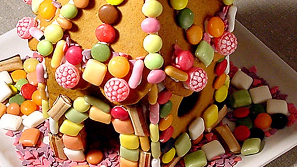 4. Laita katto paikoilleen sulan sokerin avulla, pursota sitten kuorrutetta talon päälle ja kiinnitä kuorrutteeseen makeisia. Koristele oman maun ja mielikuvituksen mukaan. Puuteroi mielellään hieman tomusokerilunta talon päälle.