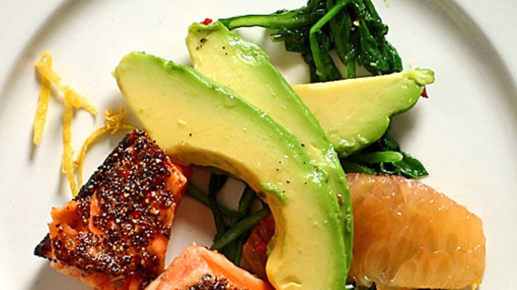 3. Kuori greippi ja leikkaa siitä terävällä veitsellä kalvottomia lohkoja. Kuori ja viipaloi avokado. Asettele neljälle lautaselle avokadoviipaleita, greippilohkoja ja salaattia. Annostele lohi lautasille ja tarjoile välittömästi.