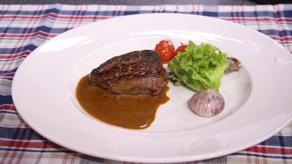 Kuumenna öljy kattilassa lämpimäksi. Freesaa pippureita öljyssä ja lisää sinappi. Sekoita ja lisää joukkoon konjakki. Lisää heti perään demi-glace kastikepohja. Anna kiehahtaa. Llisää joukkoon kerma ja keitä hiljaisella lämmöllä viisi minuuttia. Lisää tarvittaessa suolaa ja pippuria. Mausta huoneenlämpöiset pihvit suolalla ja pippurilla ja paista kuumalla pannulla voissa murskatun valkosipulinkynnen ja timjamin kanssa pari minuuttia molemmilta puolilta ja siirrä vetäytymään viideksi minuutiksi. Tarjoile uunissa paahdetun valkosipulinkynnen ja tomaatin kanssa.