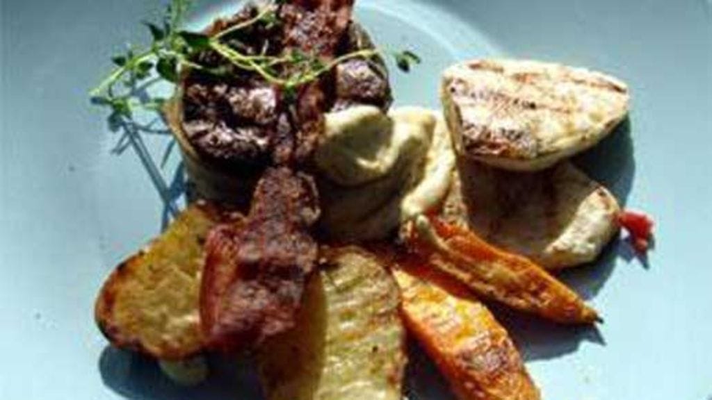 Kietaise pekoniviipale jokaisen pihvin ympäri niin, että pippurit peittyvät ja grillaa pihvejä muutama minuutti molemmin puolin. Anna lihojen vielä vetäytyä tovi ennen annosten kokoamista.