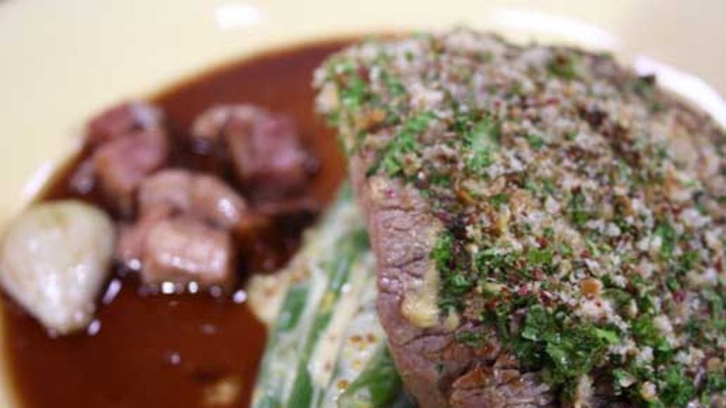 Paista pihvejä minuutti molemmilta puolilta ja valele pihvejä paistorasvalla vähän väliä. Sekoita kulhossa leipäraaste, hienonnettu persilja ja murskatut pippurit. Lisää ripaus suolaa.