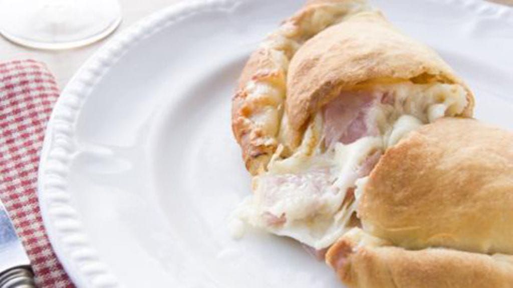 3. Kaulitse taikinasta neljä pyörylää leivinpaperille. Jaa tomaattikastike puolelle pyörylöistä, mutta jätä n. 2 cm reunasta tomaatitta. Ripottele päälle juustoraaste ja lisää kinkku. Taita se osa taikinaa, jossa ei ole täytettä, täytteen päälle. Nipistele reunat yhteen kunnolla, jotta täyte ei pääse pursuamaan ulos.