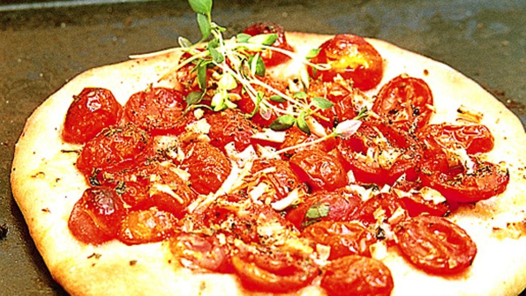 2. Kuumenna uuni 275 asteeseen. Kaulitse taikinat pyöreiksi ympyröiksi, jätä reunat hieman paksummiksi. Jaa tomaatteja tasaisesti taikinalle, mutta jätä 2 cm reunasta tyhjäksi.