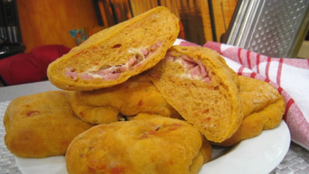 Levitä juustoraastetta ja suikaloitua kinkkua pohjille ja taittele ne nyyteiksi. Käännä nyytit pellille nousemaan ja peitä jälleen pyyhkeellä. Sivele pinta vielä kevyesti öljyllä ja paista sämpylät kypsiksi 200-asteisessa uunissa, noin 15 minuuttia.