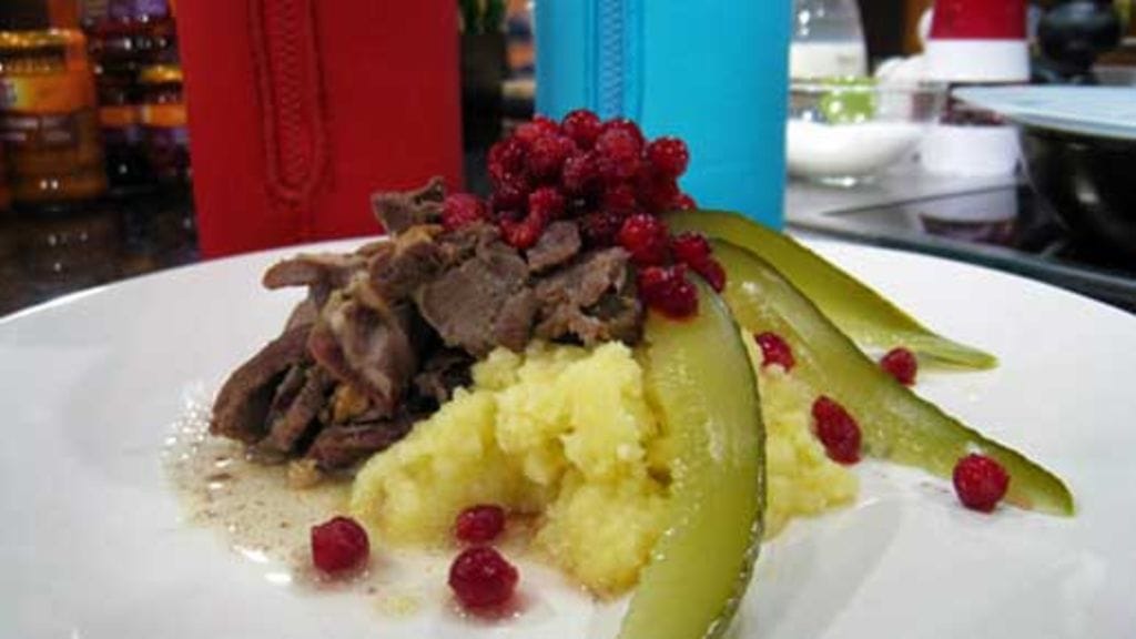 Tarjoa poronkäristys puolukkasurveen, suolakurkkujen ja runsaalla voilla aateloidun puikulaperunasoseen kera.