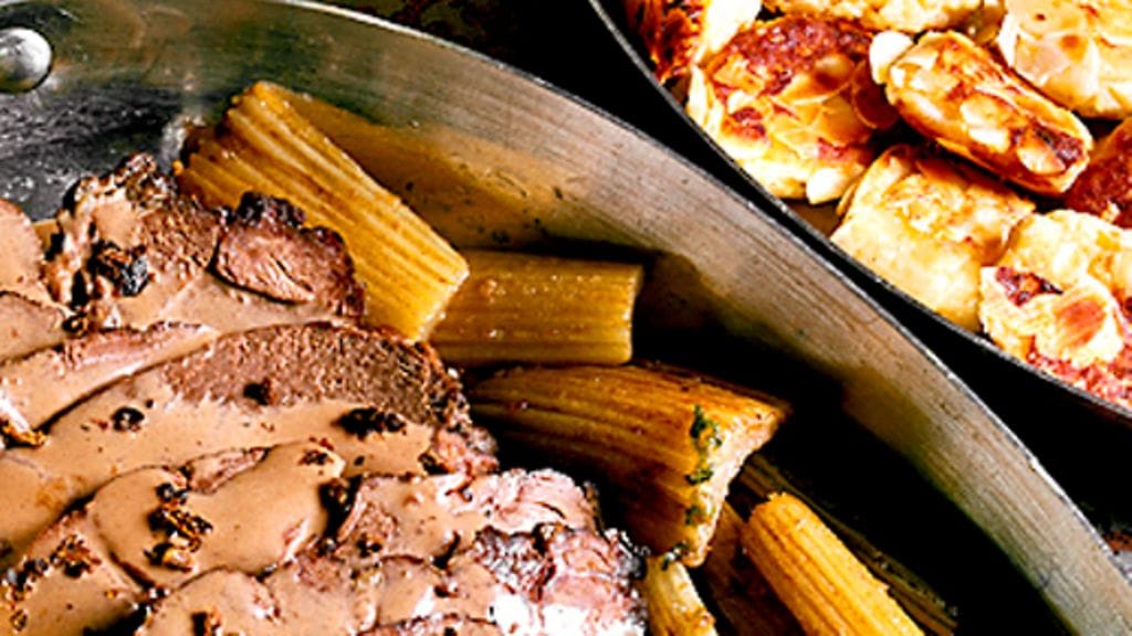 3. Vatkaa pannulta maut viinillä, siivilöi vuokaan. Murusta mukaan liemikuutio, lisää vettä. Pistä lihaan paistolämpömittari. Paista uunin keskitasolla kunnes sisälämpötila on 67-70 astetta.