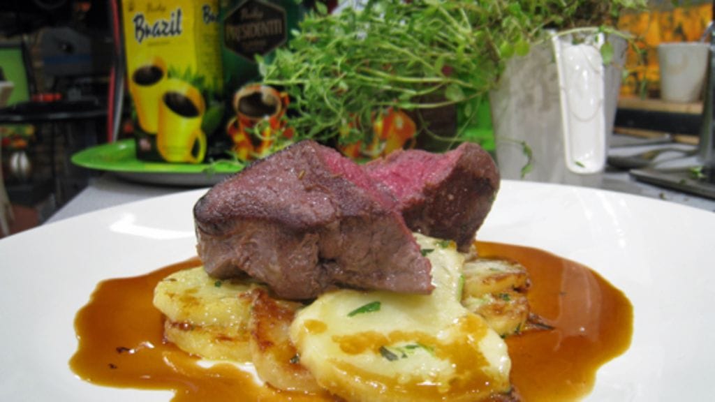 Kaada demi glase –kastikepohja pannulle ja kiehauta se. Mausta kastike murukahvilla tai erittäin voimakkaalla kahvilla, hunajalla ja balsamicolla. Kun kastike on kiehunut tovin kokoon, siirrä se sivuun hellalta ja nosta pihvit kastikkeeseen.