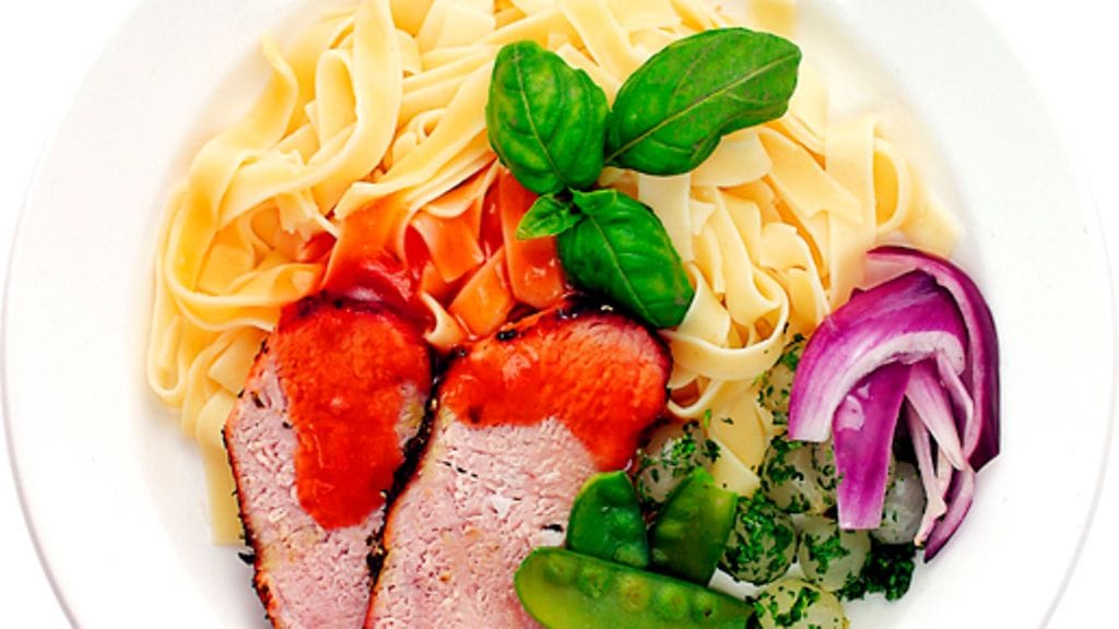 3. Tarjoile liha pastan, hillosipuleiden, sokeriherneiden, punasipulin, tuoreen basilikan ja halutessasi punaviinikastikkeen kera.