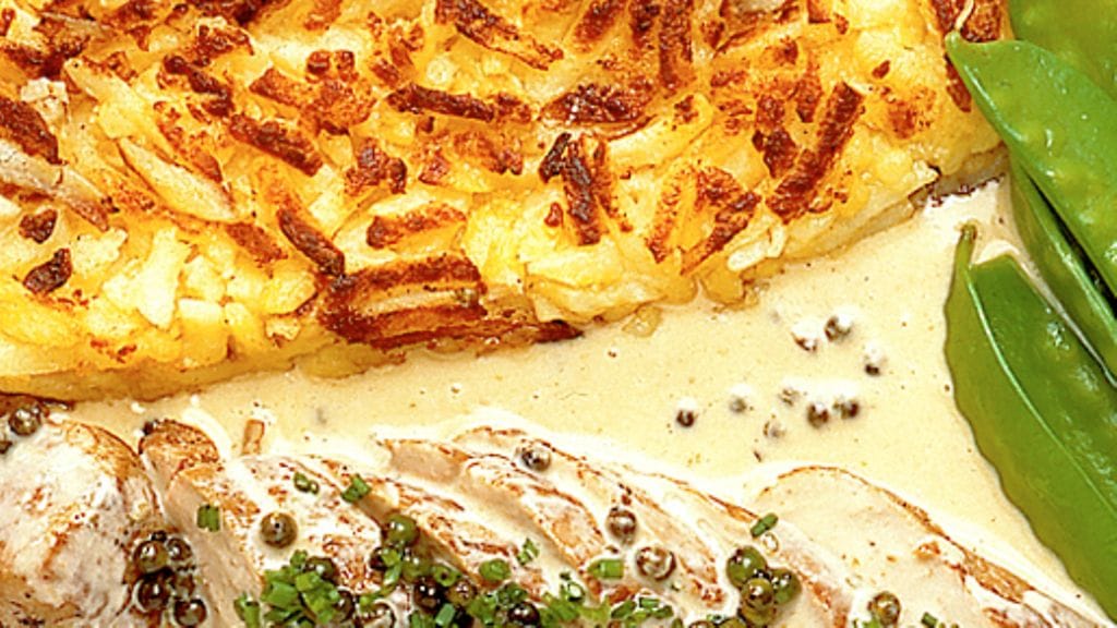 3. Liha: Maista kokonainen filee suolalla ja vastajauhetulla pippurilla. Paista ruskistetussa voissa 10-15 minuuttia lihan koosta riippuen. Tarjoile perunakakun, kastikkeen, ja kevyesti keitettyjen sokeriherneiden kera.