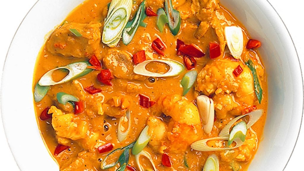 2. Kuori ja hienonna sipuli ja valkosipuli. Paista sipuli pehmeäksi öljyssä, lisää valkosipuli ja jatka paistamista, kunnes sipuli on kullanruskeaa. Sekoita joukkoon maapähkinävoi ja lihan keitinliemi. Lisää kurkuma ja keitä kastiketta, kunnes se saostuu.