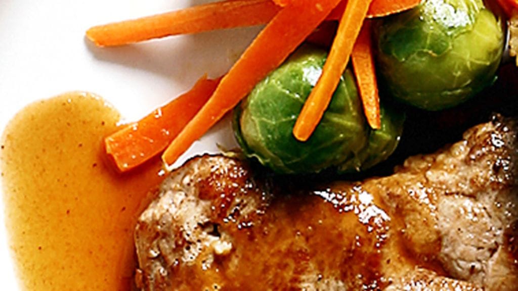 3. Leikkaa porsaanfileestä pois jänteet ja rasva ja viipaloi se. Nuiji viipaleet ohuiksi, mausta suolalla ja pippurilla ja paista tai grillaa 1 ½ minuuttia molemmin puolin. Paista vihannekset voissa. Mausta suolalla ja pippurilla.